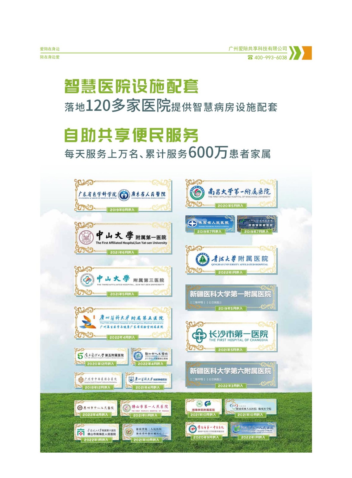 愛(ài)陪共享產(chǎn)品與服務(wù)已經(jīng)供入廣東省人民醫(yī)院、中山大學(xué)附屬第一醫(yī)院、中山大學(xué)附屬第一(南沙)醫(yī)院、中山大學(xué)附屬第三醫(yī)院嶺南醫(yī)院、南方醫(yī)科大學(xué)第五附屬醫(yī)院、廣州醫(yī)科大學(xué)附屬腫瘤醫(yī)院、廣州醫(yī)科大學(xué)附屬第五醫(yī)院、廣東省中西醫(yī)結(jié)合醫(yī)院、廣州市中西醫(yī)結(jié)合醫(yī)院、長(zhǎng)沙市第一醫(yī)院、陜西省人民醫(yī)院、南昌大學(xué)附屬第一醫(yī)院、新疆醫(yī)科大學(xué)附屬第一醫(yī)院、第六醫(yī)院等 120 多家醫(yī)院提供智慧病房配套和智慧租賃便民服務(wù)。