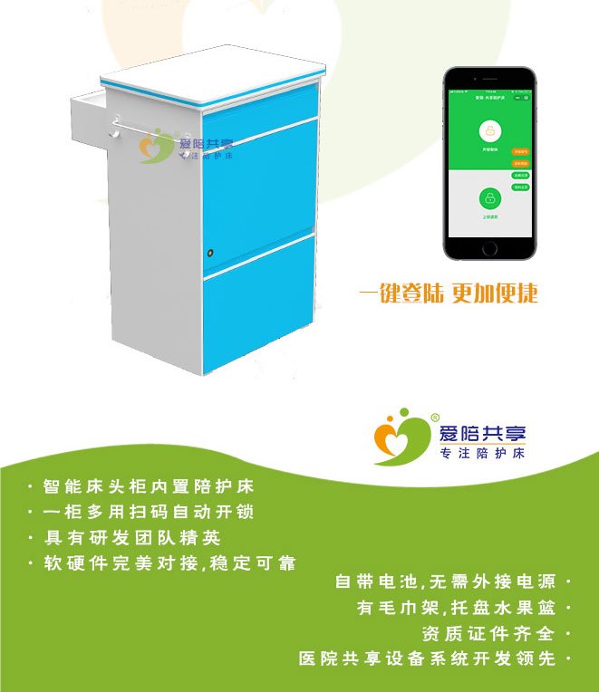 共享陪護(hù)床其實(shí)是一款共享智能設(shè)備,把陪護(hù)床和(陪護(hù)椅)床頭柜用特質(zhì)的鎖具和專門(mén)的小程序軟件聯(lián)系起來(lái),可做床頭柜放置在醫(yī)院病房里,內(nèi)藏著一張折疊床,如果是陪護(hù)椅共享陪護(hù)床平時(shí)充當(dāng)椅子,陪護(hù)人員使用時(shí)用手機(jī)掃碼打開(kāi),就可以休息。